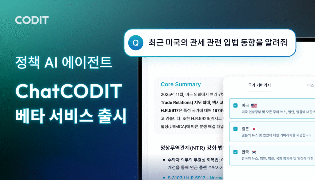 AI 기반 법·정책·규제 플랫폼 기업 코딧(CODIT)이 글로벌 AI 정책 에이전트 ‘챗코딧(Chat CODIT)’ 베타서비스를 출시했다.