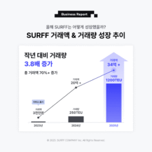 해상 운임 솔루션 기업 서프컴퍼니가 2025년 거래액 34억 원을 기록했다고 밝혔다. 전년(20억 원) 대비 70% 증가한 수치다. 연간 물동량은 1,200 TEU로 전년(250 TEU) 대비 3.8배 ...
