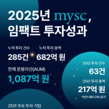 임팩트 투자사 엠와이소셜컴퍼니(MYSC)가 2025년 연간 투자 실적과 운용 현황을 공개했다. MYSC가 2025년 한 해 동안 총 63건, 약 217억 원 규모의 투자를 집행했다. 이는 전년 ...